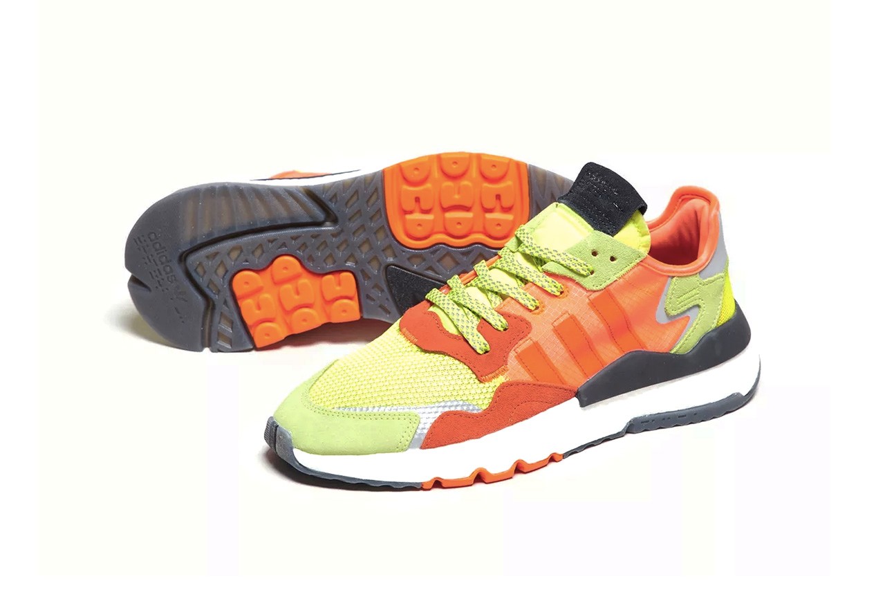 adidas Originals collaborated with Size? on a hi-vis Nite Jogger silhouette overhaul, referencing the OG Nite Jogger’s color palette of luminous orange and white from 1979.
