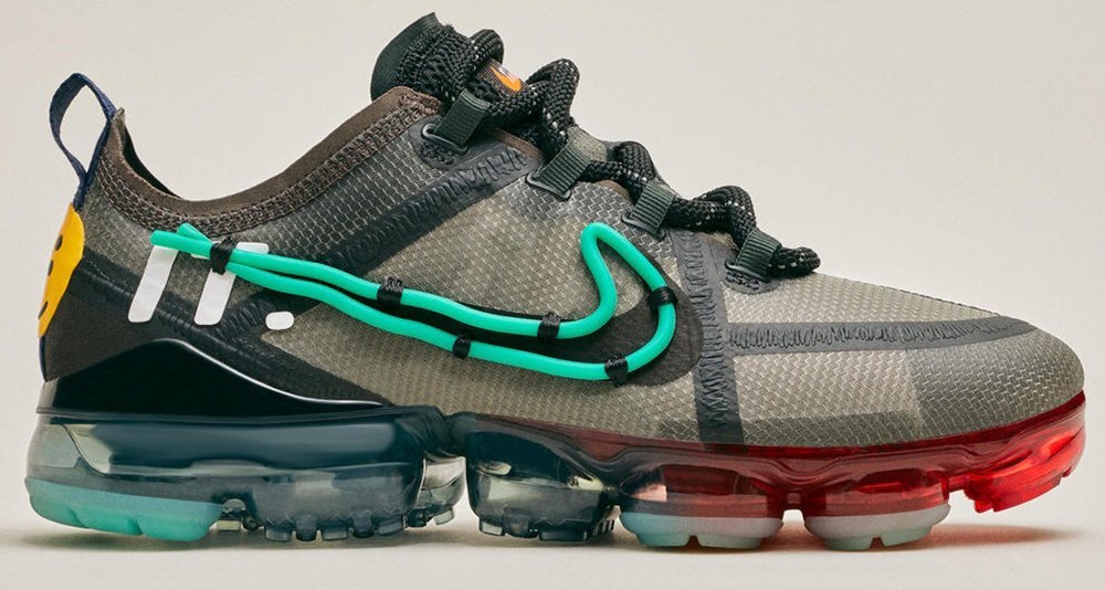 Cactus Plant Flea Market x Nike VaporMax 2019: This uniquely modified model is highlighted by the teal plastic Swoosh attached over the olive green base Swoosh. The army-green shoe also features extra ‘messy’ seam reinforcement and a hiking boot-inspired lacing system with oversized rope laces. Finally, it sits on a bed of two-toned VaporMax tooling, with a classic Nike logo used on the tongue and some sort of ‘Just Do It’ design around the heel.The shoe highlights fused reinforcements as well as two-toned VaporMax tooling.