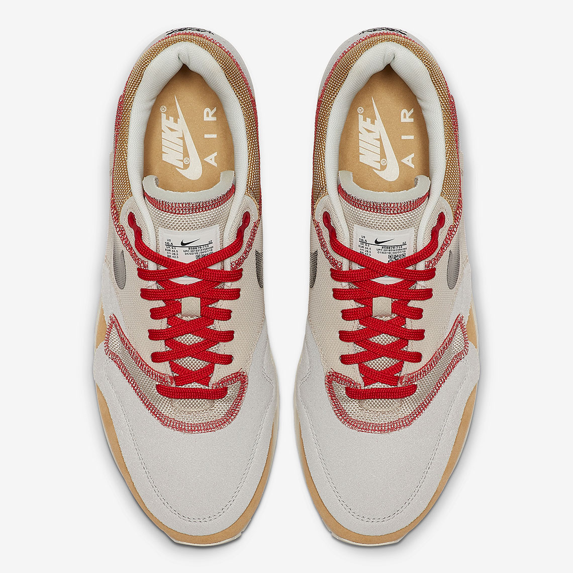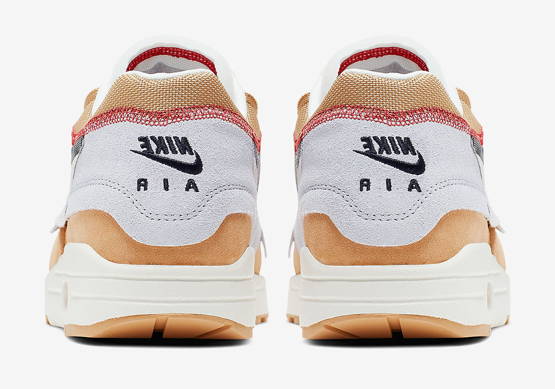 The shoe features a vintage golden brown as its base, similar to the colors featured on the Tom Sachs x NikeCraft Mars Yard 2.0. Shades of grey and tan cover the rest of the upper, with bold red used for the laces, stitching, and Air bubble. The midsole of the shoe is white with a white and gum outsole. Final details denoting the ‘inversion’ of the shoes insides include inverted heel logos and a sizing label on the exterior of the tongue.
