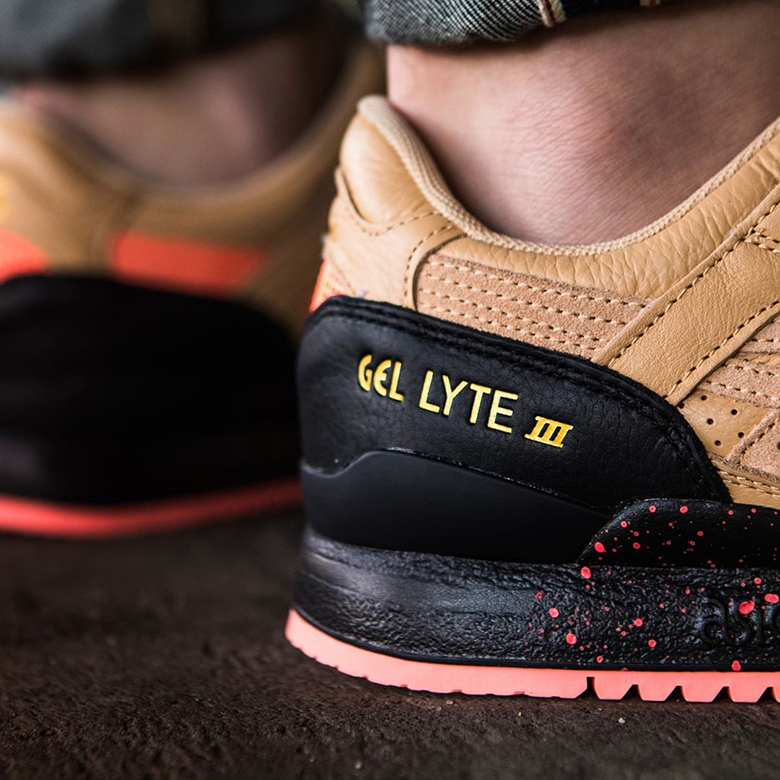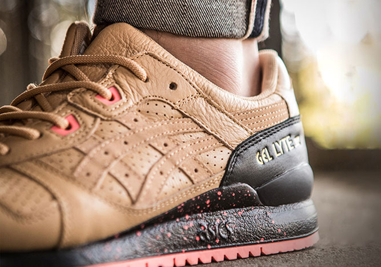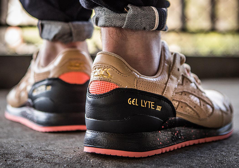 The Asics Gel-Lyte III “Tiger Snake” begins with a base of light brown cowhide leather, accented by pinkish-orange used on the eyelets, mudguard, and on the medial logoing. The midsole and heel counter are black with a speckling of the same pinkish-orange, which is also repeated on the outsole for a finishing touch. The GEL-Lyte III logoing is done in gold that pops off the black heel counter.