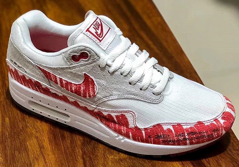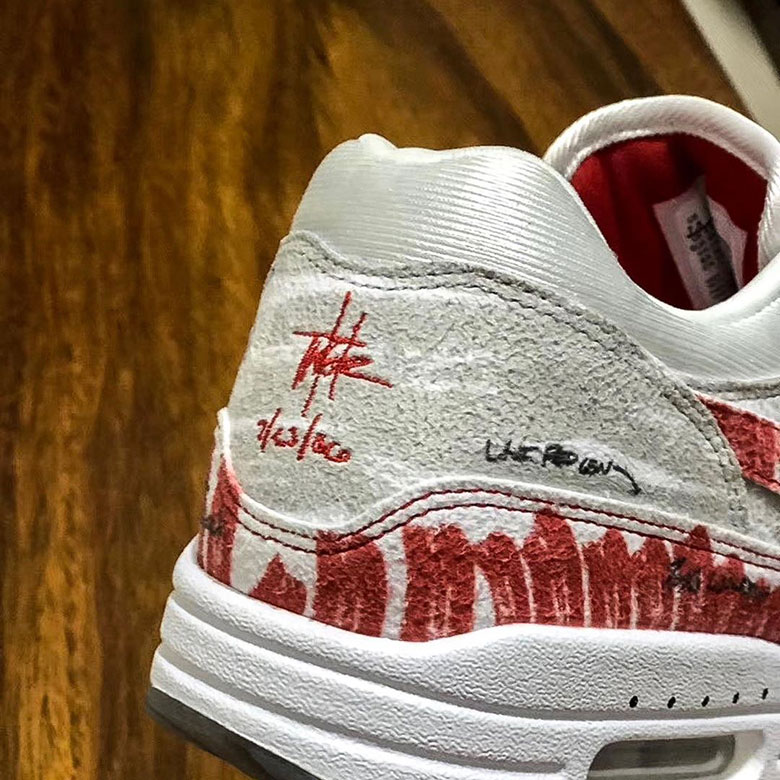 The Nike Air Max 1 “Tinker’s Sketch” features a colorway similar to the beloved University Red, but this time, the red is ‘sketched’ on. The tongues and Swooshes feature this scrawled red. Notes and other markets by Tinker are seen on the mudguards and heels, and the shoe is finished off with Tinker’s signature on the heel.