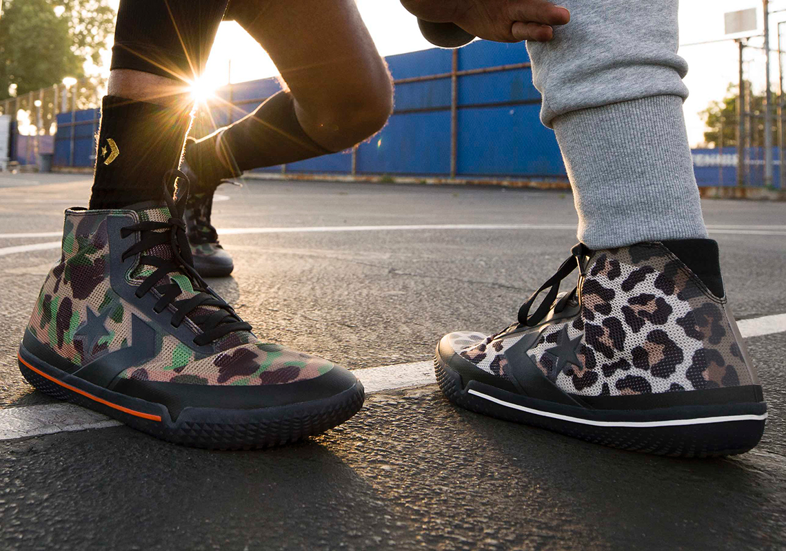 Converse continues to build-out their rejuvenated basketball program, centering around the Converse All Star Pro BB . This new pack features Converse’s upgraded classic in some classic, archived Converse colorways: a colorful camo print and a glow-in-the-dark cheetah covering.
