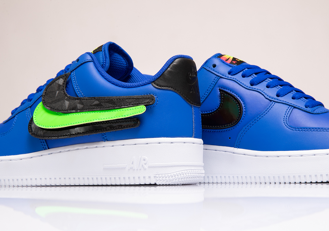 This new modular Air Force 1 features a blue leather base, with matching blue laces. The sole is all white, with black detailing on the heel and tongue tags, respectively. The primary excitement comes from the interchangeable Swooshes. The pair comes with three different Swooshes: a gray geometric mosaic print, a volt green color, and finally an iridescent black. Unlike previous models with multiple Swoosh options, the Swooshes do not wrap around the heel of the shoe. The tongue and heel patches are also not interchangable, as they had been in other modular Nike AF1 releases, for a more simplified experience