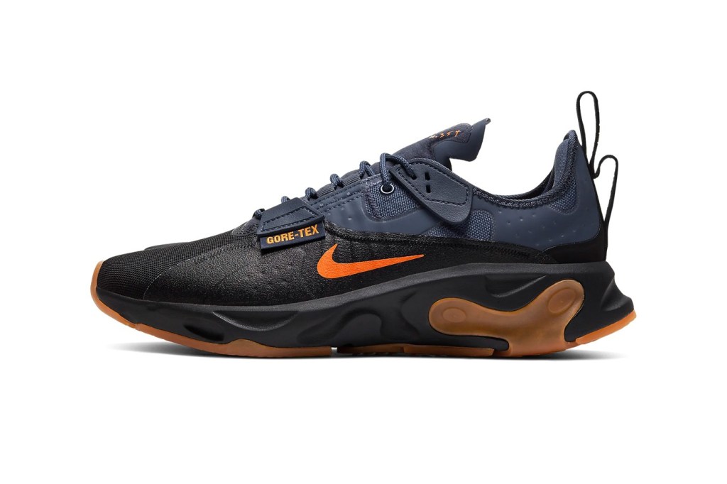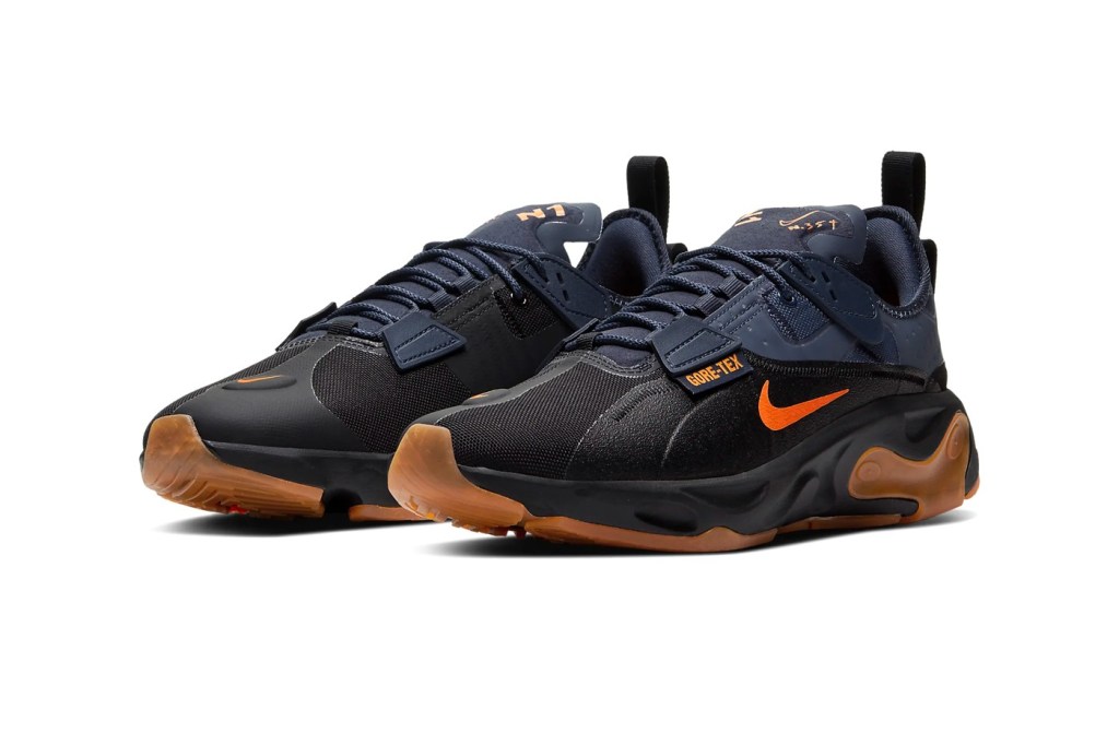 The pictured version of the Nike React GTX features a black and light carbon colorway accented with orange and navy details and finished off with a gum-infused midsole. The lower half of the show is shrouded in a matte black overlay of waterproof material, with navy taking the upper portion of the shoe. Doubled up pull tabs and extra paneling on the topmost eyelet add extra additive features. “N1” and “N .354” branding can be found in orange on the tongue and insole, with orange Swooshes and ‘GORE-TEX’ rounding out detailing on the upper. The model is also available in a white colorway.