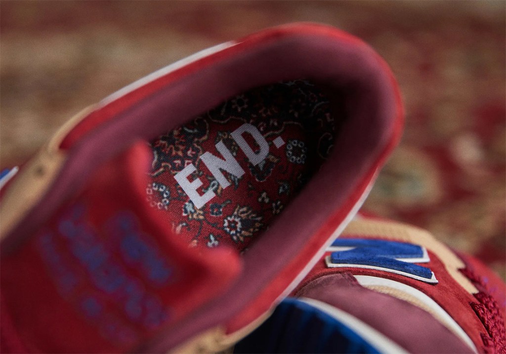The lifestyle silhouette gets its “Persian Rug” name because it draws heavy inspiration from Iranian interior decorating styles. The upper uses luxurious red, navy, and beige colors found in Iranian households on a mix of high-end suede, leather and mesh. Matching floral patterns are printed on the insoles to further express the carpet motif apparent on the upper. “END” branding is also printed atop the insoles as a nod to its moniker, and completed down below with two-tone tread. Finally an END x New Balance box with the same theme wraps up the whole project.