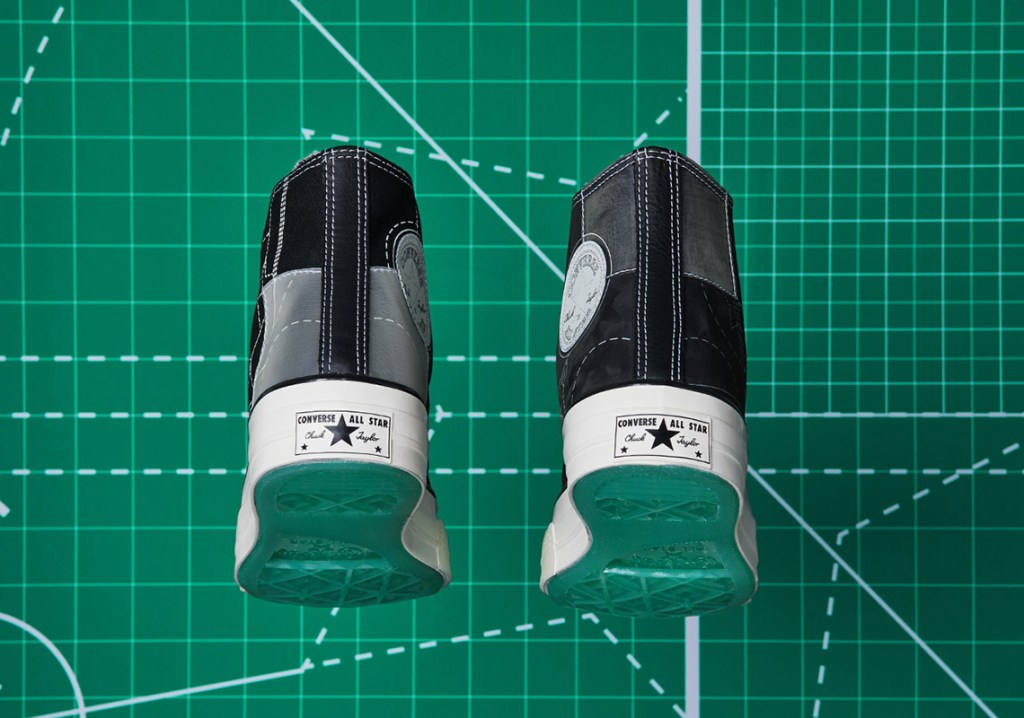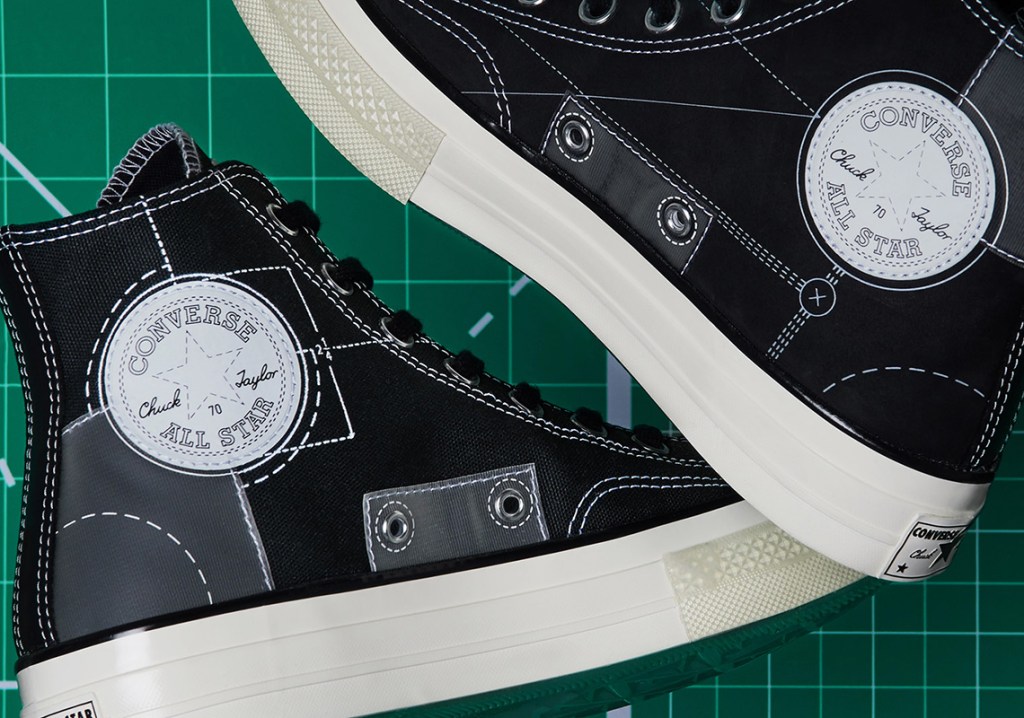 The simplicity of the “Blueprint” pack upper coloring is maximized by the other details the brand worked with Converse to add: translucent soles encasing emerald green pop, interesting print design and translucent TPU hits on the upper. The use of clear TPU film, in particular, is something that makes this collaboration stand out among other Converse projects.