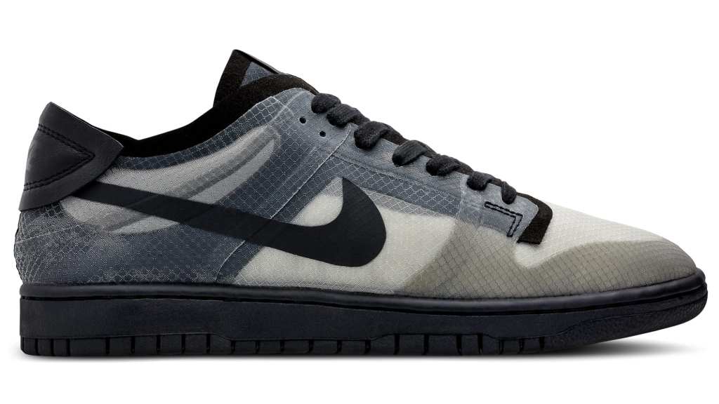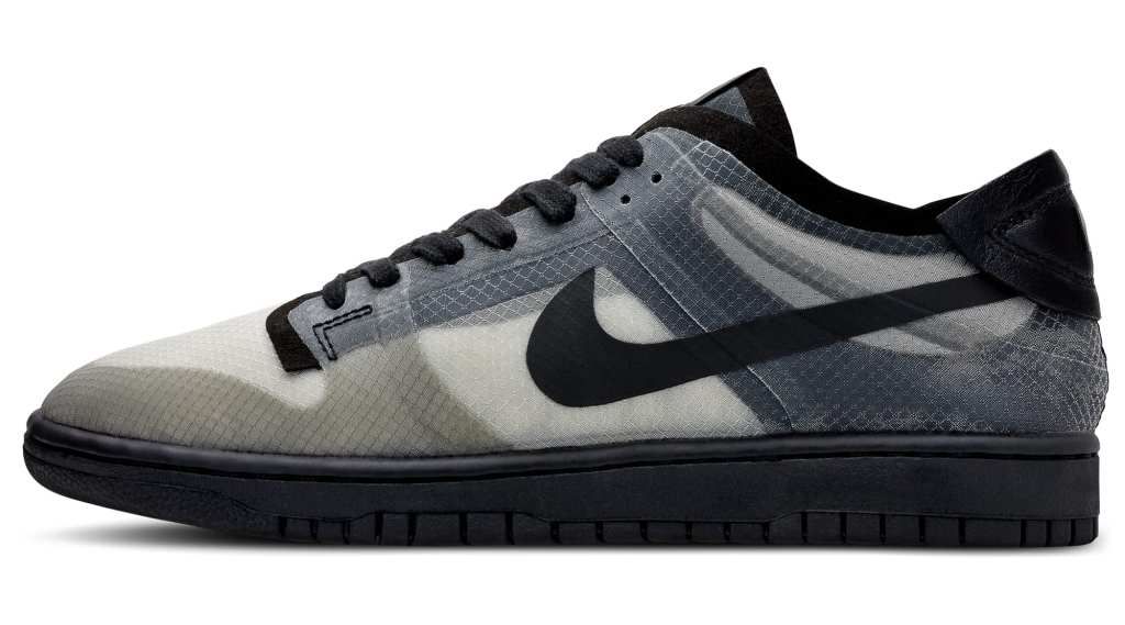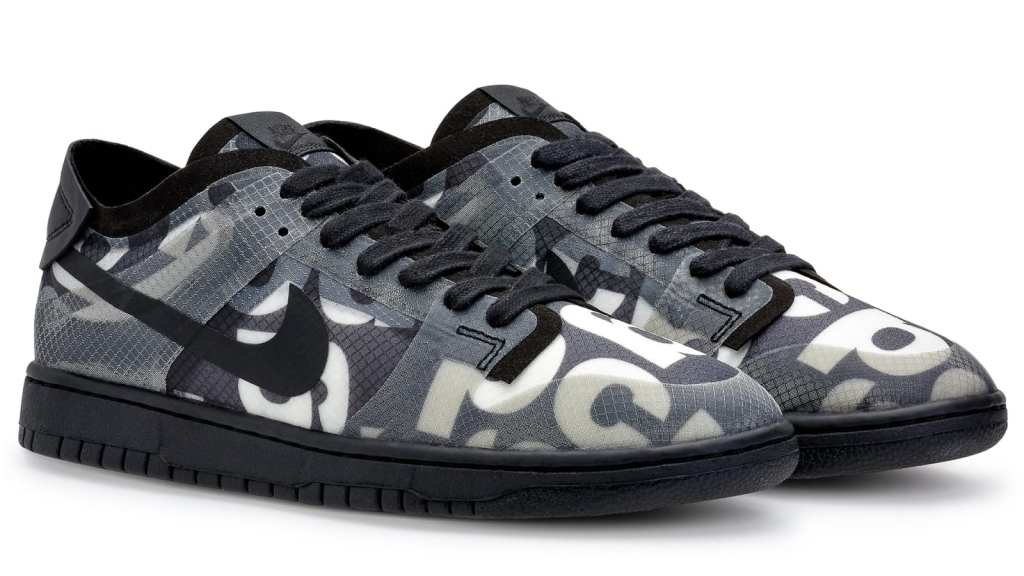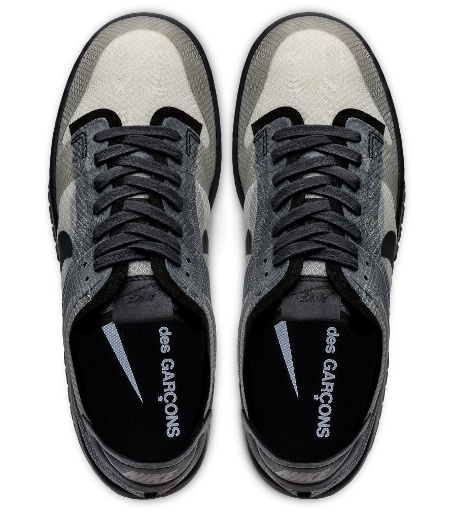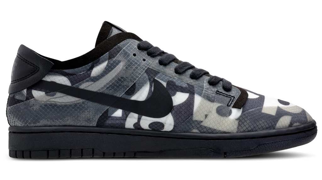 The COMME des GARÇONS x Nike Dunk Low is featured in two colorways, both in darker shades of black and tan. Both models feature an upper constructed from a lightweight, translucent stretch-woven fabric called Nexkin. Beneath layer of Nexkin, the models have widely different looks. One features a black base with all-over ‘CDG’ print, while the other features tans that highlight the upper’s construction. Overlays of leather heel and Swooshes finish off the shoe.